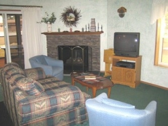 The open-concept layout includes a large living room with a 55″ flat-screen TV, Blu-ray player, gas fireplace, and plenty of seating for relaxing with family or friends. The primary bedroom features a king-size bed and a 47″ smart TV, while the second bedroom includes three twin beds, and the third bedroom offers two twin beds. A queen-size futon in the living room provides additional sleeping space, making the cabin a great fit for larger families or small groups — comfortably sleeping up to eight.