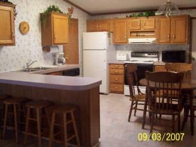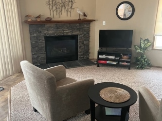 Inside, the living room features a gas fireplace, central air conditioning, sleeper sofa, and flat screen TV, providing a cozy space to unwind after a day outdoors. The layout is open and functional, with easy access to the kitchen and dining area, creating a space that feels relaxed and connected.